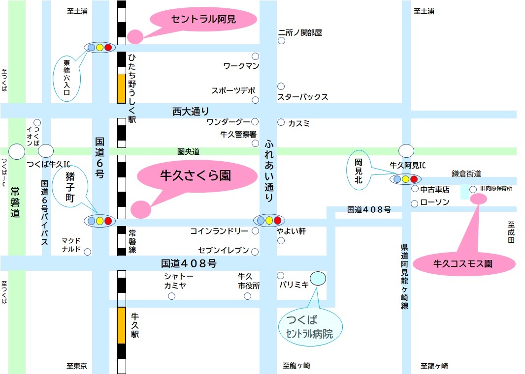牛久さくら園:圏央道つくば牛久インターチェンジから約5km。国道6号線「猪子町」交差点から約1分。